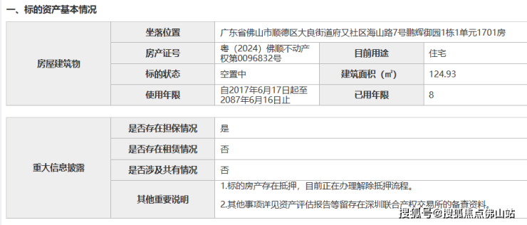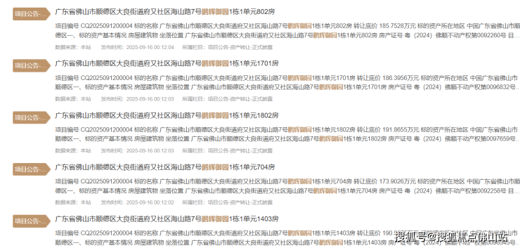 9月16日,深圳联合产权交易所显现,6套顺德大良鹏辉御园的房源被挂出,挂牌金额在173万-191万之间,单价约1.39万/㎡。